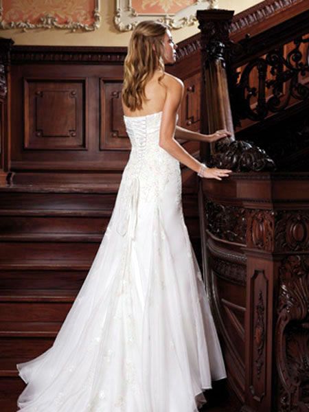 This kind of wedding dress is decorated with beadings. It has strapless neckline, A-line silhouette and made of satin.