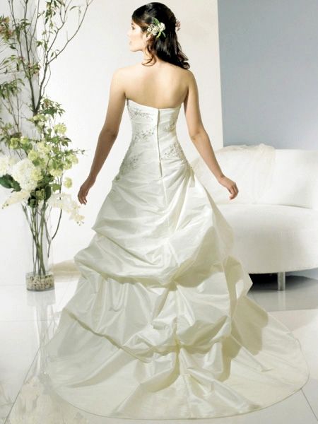 This kind of taffeta wedding dress features strapless and draped design,A-line silhouette, the bodice is decorated with lace applique embellishment.The similarity of photograph is 97% probablay. This dress is available in other colors.