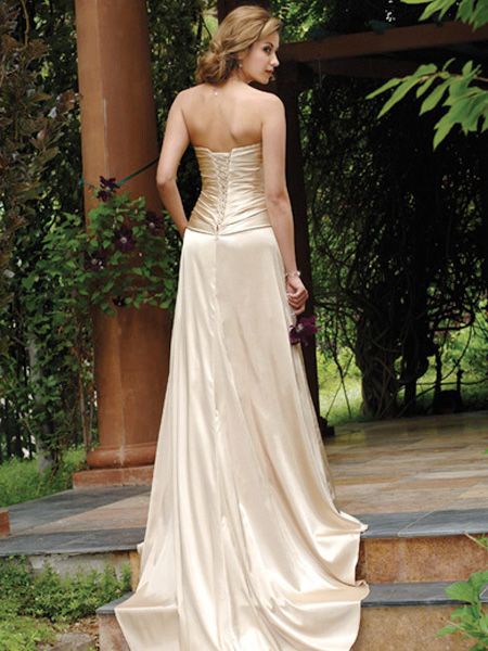 This kind of elastic satin wedding dress is decorated with beadings. It features its strapless neckline, column silhouette. It is made of elastic satin.