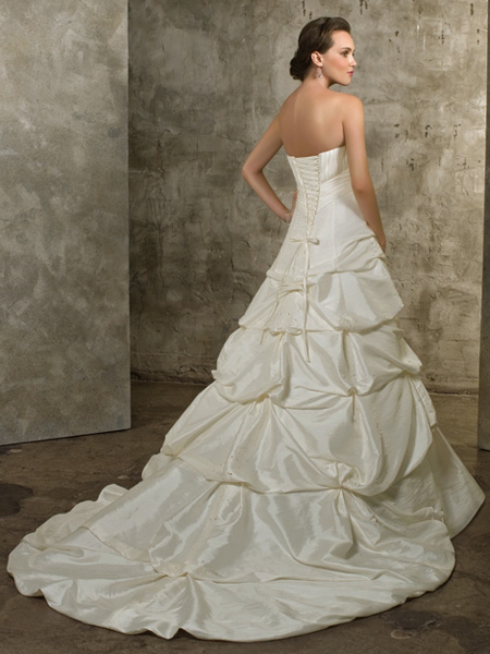 This kind of taffeta wedding dress features strapless and draped taffeta design,A-line silhouette, the bodice is decorated with beads embellishment.The similarity of photograph is 97% probablay. This dress is available in other colors.