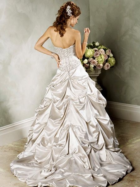 This kind of taffeta wedding dress features its pick ups skirt design. There are appliques beadings decorated around the bodice of the dress.The real goods will be 95% matched with the photo.