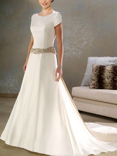 This kind of wedding dress has a short sleeves design, A-line silhouette and made of satin. It also features its beige sash design.
