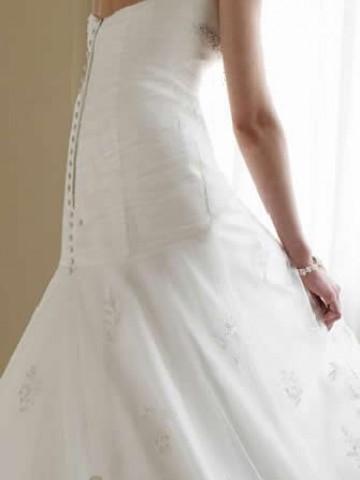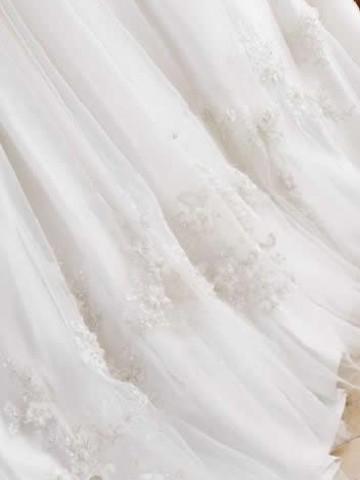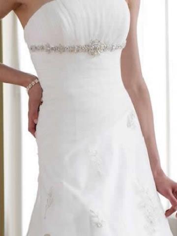 It has a softly curved neckline, ruched bodice with beaded applique lace waistline.
