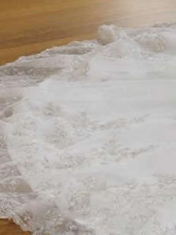 The lace applique skirt adorned with flower decoration spills into a chapel length train.