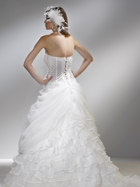 This kind of organza floor length wedding dress features strapless sweetheart design, ball gown silhouette, the bodice is decorated with beading embellishment while the skirt is with ruffles.The similarity of photograph is 97% probablay. This dress is available in other colors.
