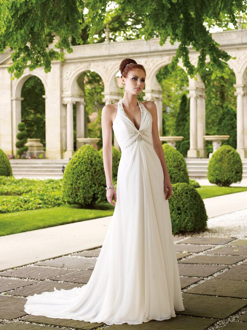Absolutely gorgeous halter wedding gown! Beautiful beading, flowy chiffon, and the A-line silhouette is flattering.