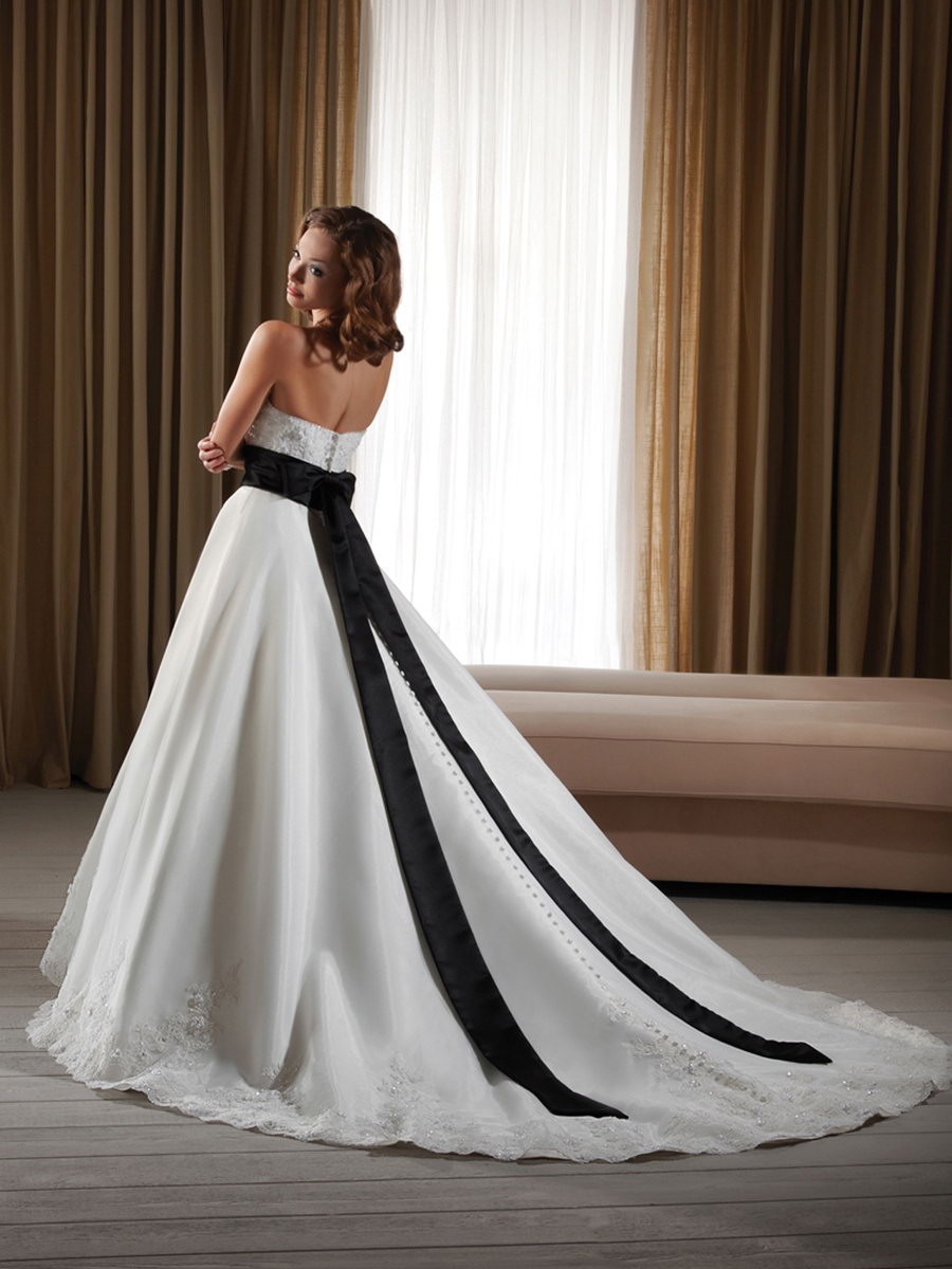 Noble Floor Length A-Line Strapless Low Back Sweep Train With Embroidery,Black Sash,Button Wedding Dresses WDresses01044