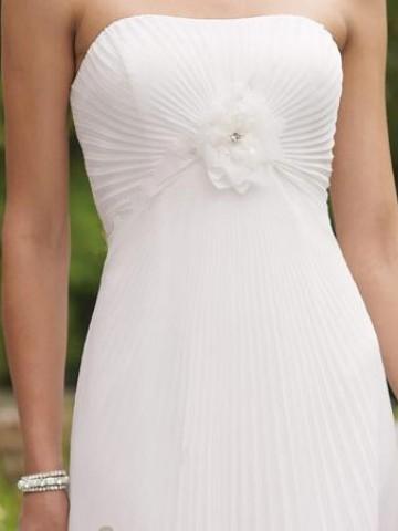 The simple a line strapless dress is made of chiffon.