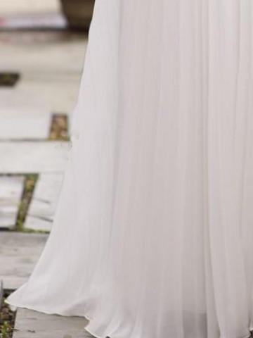 The sweep train breaks the quietness of the simple dress.