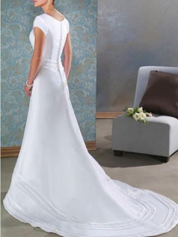 This kind of wedding dress features its sash decoration and jewel neckline.