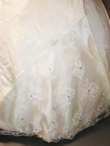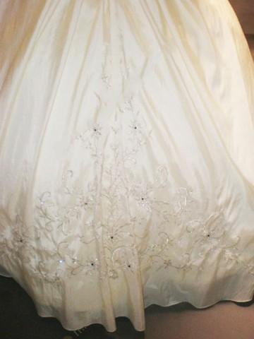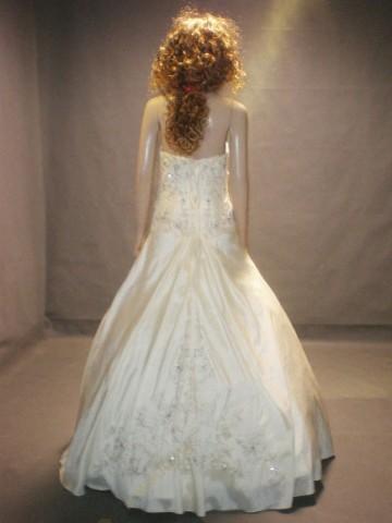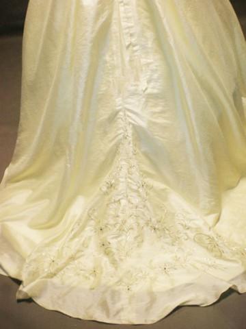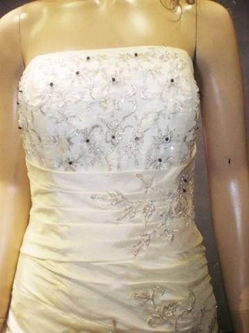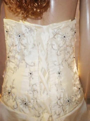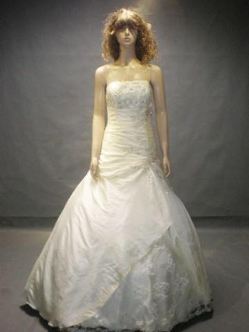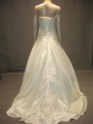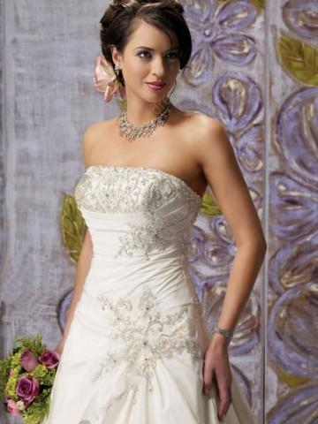White wedding dress features strapless design.