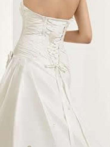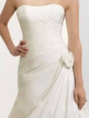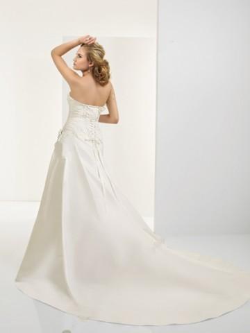 The strapless gown features a line silhouette.