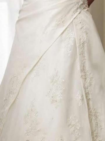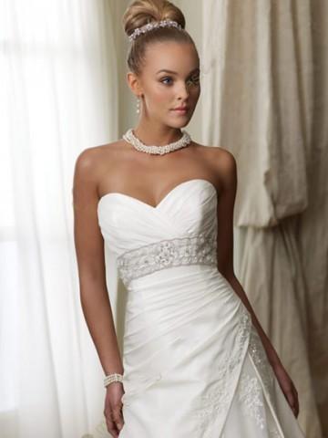 The sweetheart taffeta bridal gown features pleated bodice with beaded empire waistband.