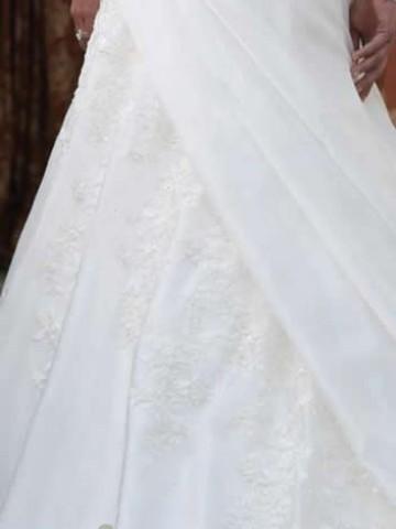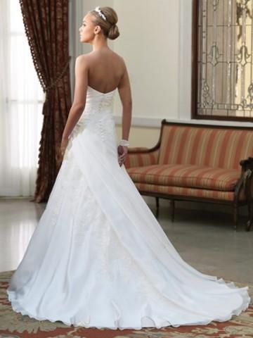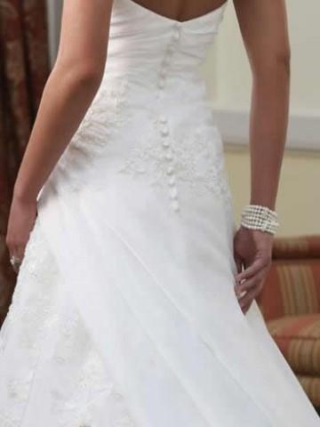 The back bodice features covered buttons with a chapel length train.