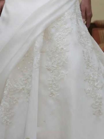 The side gathered pleated skirt reveals a beaded lace underskirt.