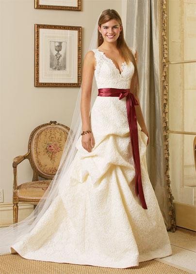 Re-embroidered lace v-neck gown with full bustle skirt and satin ribbon at waist. Chapel train.