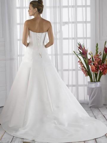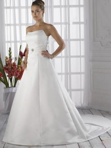 This kind of wedding dress features strapless design.Asymmetrical pleating crosses the waist and gathers to the middle waist with beading decoration.Corset closure.Satin skirt radiates from the natural waist and sweeps on the floor.One piece A-line satin dress accents its simple feeling.