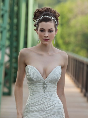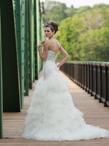 Shipping Weight: 3.5KgStrapless charmeuse and tulle modified ball gown with deep plunging sweetheart neckline, ruched charmeuse bodice features a hand-beaded Empire motif, chevron pleating and dropped waistline, dramatic multi-tiered pleated tulle skirt.