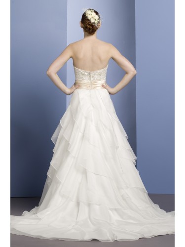 Strapless sweetheart wedding dress With embroidery detail on Bodice. The charmeuse waistband on this bridal gown compliments the asymmetric tiers of organza. Waistband can match bridesmaid dress colors. Optional spaghetti straps. Two-tone available.