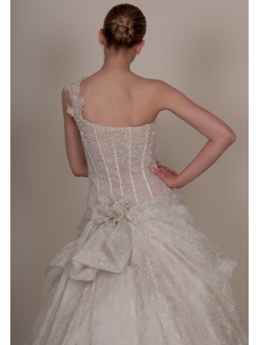Specials: Lace Ruffled One-Shoulder Strap Asymmetrical Neckline with Boned Bodice with Sequins and Pick-up Skirt with Chapel Train