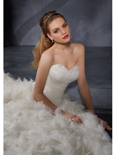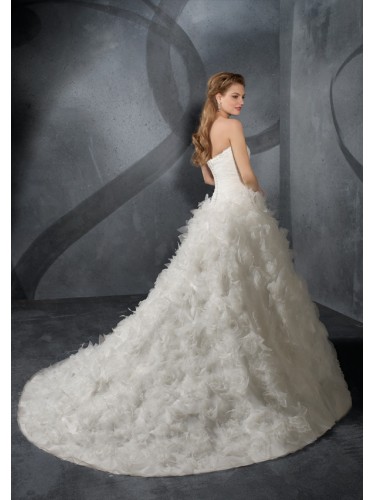 Draped tulle overlays the lace Bodice with intricate beading. Hand made tulle and organza flowers create the romantic ball gown skirt with a chapel train