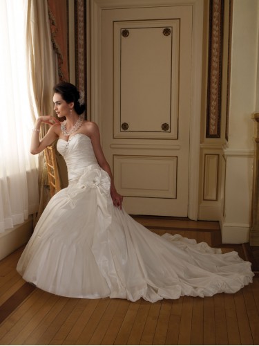 Shipping Weight: 3.5KgStrapless luxurious taffeta ball gown, sweetheart bust line with asymmetrical hand-beaded jeweled trim, gathered bodice with aSymmetrically dropped waistline and low dipped back with covered buttons, gathered skirt features a side split apron skirt and tulle underlay with dramatic draped detail and three-dimensional flower, bubble hemline and train.