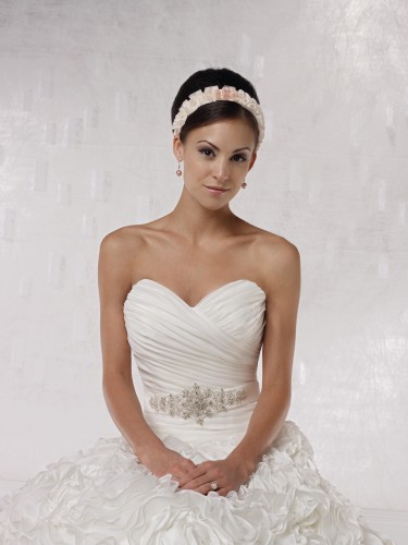 Off-the-shoulder organza and taffeta ball gown with V-neckline, ruched crisscross bodice accented with hand-beaded ribbon belt, slightly dropped waistline, dramatic full ruffled swirl skirt with chapel length train.
