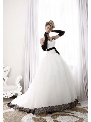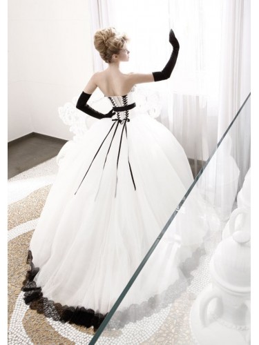 Specials: Organza Strapless Lace Sweetheart Neckline with Gathered Bodice with Black waistline and Corset back and Fluffy Skirt with Chapel Train and Lace Appliqued Hemline