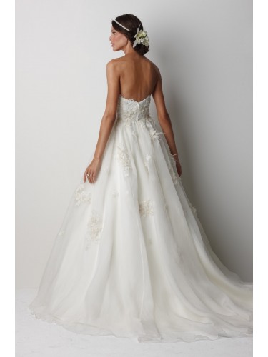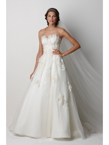 washed silk organza ball gown with sheer sweet crumb neckline, beaded and embroidered lace midriffs and traversing skirt. Lace motifs are embellished with crystals, organza and ostrich feathers, and features a 69" Chapel train.