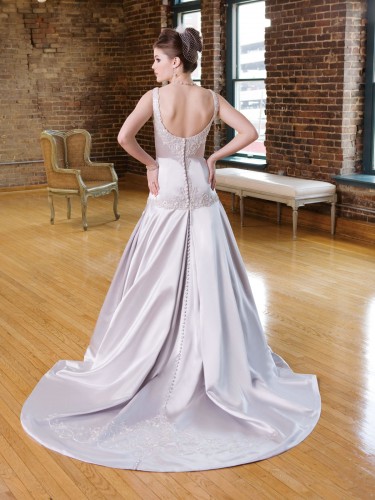 Intricately beaded scoop neck line, beaded motif at waist, fitted through hip. Dropped Ball Gown with double inverted pleats in skirt in radiant satin. Beading on cathedral train.Tips: Accessories not included