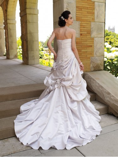 Shipping Weight: 3.5KgStrapless satin ball gown, directionally pleated bodice with aSymmetrically dropped waistline, dramatic pick-up skirt pinched with three-dimensional handmade satin and organza flowers, train.