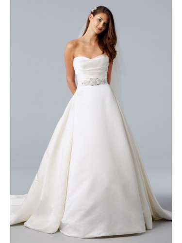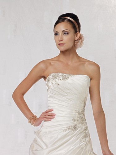 Strapless satin ball gown, asymmetrically draped bodice embellished with hand-beading and embroidery, back covered buttons, dropped waistline, tiered modified pick-up skirt with pleated underskirt, chapel length train.