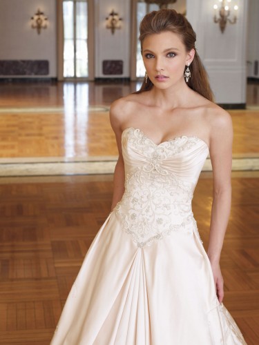 Shipping Weight: 3.5KgThis breathtaking strapless sweetheart ball gown is crafted from luxurious satin with a gathered bodice lavished with a hand-beaded and embroidered midriff. Michelle also presents a fitted bodice with a functional corset back and a full skirt with Basque waistline, center front pleat detail and matching hand-beaded embroidered train.