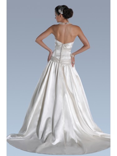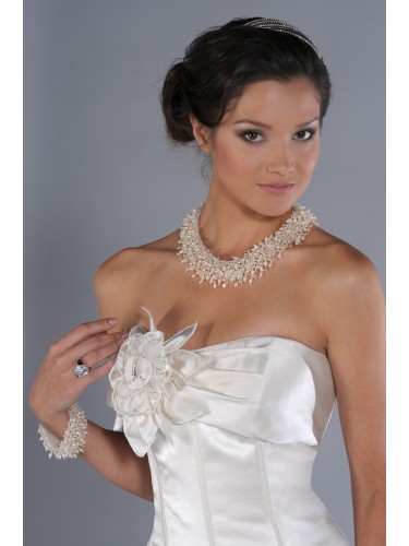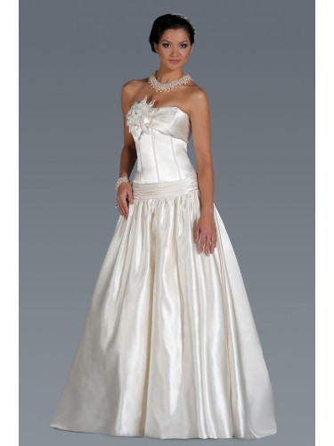 Sweetheart corseted Bodice With A dropped waist full skirt is accented by A large, 3-D beaded flower at bust.