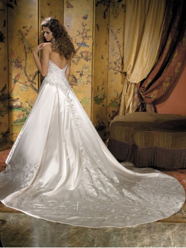 Sweetheart ballgown With silky organza tiers accented by embroidered satin bands. Waistband closes at back With embroidered bow.