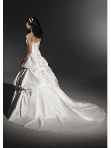 Swarovski crystals edge the strapless neckline with appliques trimming the asymmetrically draped bodice. A billowy waterfall skirt with an extra full chapel train.