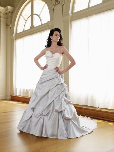 Shipping Weight: 3.5KgStrapless silk shantung ball gown, sweetheart pleated bust line adorned with dramatic loop with beaded center, directionally gathered bodice with aSymmetrically hand-beaded lace appliqu