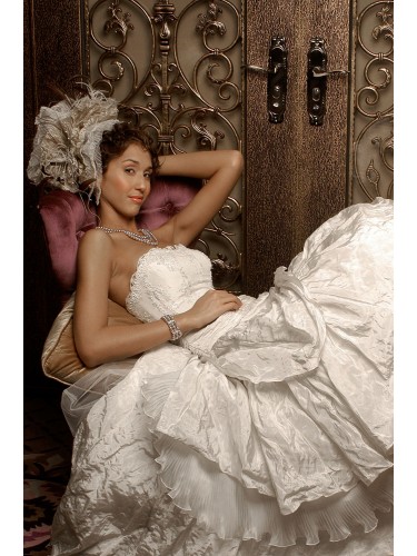 is a gown that is very reminiscent of the creations of Oscar de la Rente. The mix of textures and fabrics creates a carefree gown that is very luxurious. This is the modern woman's big beautiful wedding dress.