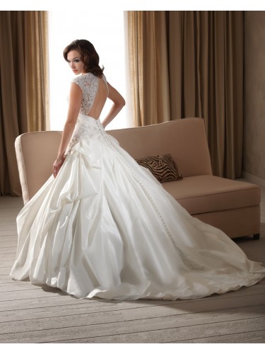 Shipping Weight: 3.5KgA traditional style with modern touches, this gown features an Alencon lace modified Queen Anne neckline with open cap sleeves that drape over the Shoulder revealing an open cut out illusion back. A pleated natural band wraps around the waist with floral rosette appliques. Beaded Alencon lace covers the bodice and falls into the billowing tucks and pleats of the draped ball gown skirt and button trimmed semi-cathedral train.