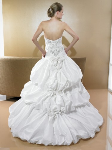Swarovksi crystals and embroidery adorn the Queen Anne neckline and detachable build-up. Hand made floral embellishments are placed within the skirts' pick ups leading the the lace insert panel with scalloped lace hem. Finishes with a bubble hem train and zipper closure.