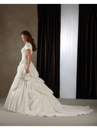 Shipping Weight: 3.5KgA traditional style with an Alencon lace covered bodice. A pleated overlay wraps along the edge of the short sleeve. The skirt and semi-cathedral train is voluminous with tucks and cascading bustles down the semi-cathedral train.