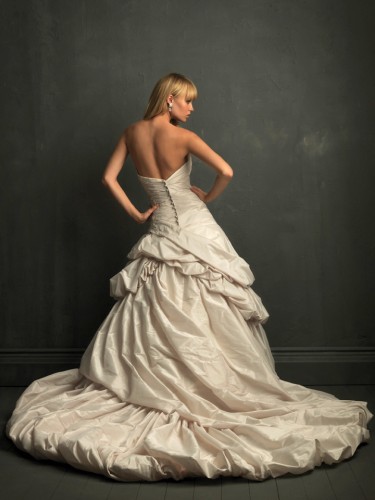 Shipping Weight: 3.5KgDescription: A romantic Ball Gown constructed out of rich taffeta. The strapless bodice is ruched asymmetrically and is adorned with beautiful crystal embellishments while the full skirt is created by luxurious pickup details. A bubble hem and Allure's signature button detail complete this gown.