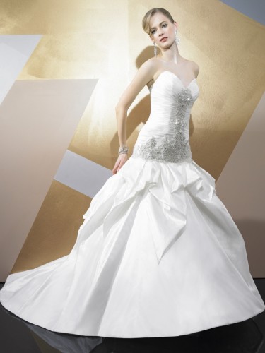 Strapless unique Italian Silk Taffeta ball gown with pickups, elegant silver lace, and Swarovski beading throughout the bodice.