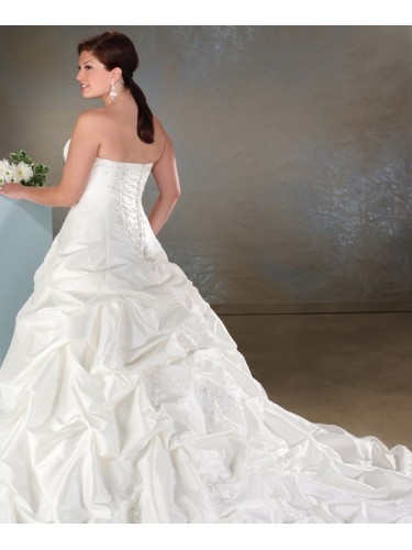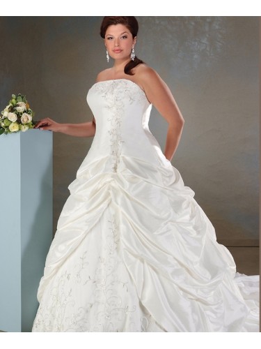 Shipping Weight: 3.5KgStrapless princess cut gown. Embroidery and beading drapes from the neckline down to the side of the fitted bodice to the pulled up bustling gathers of the skirt revealing an embroidery tulle overlay of scrolling floweres and leaves. The lace-up ties down the back to the billowing lace accents.