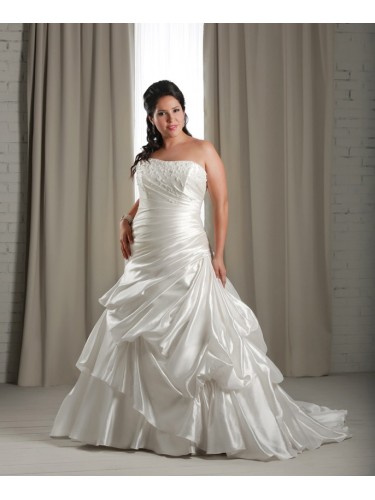 Shipping Weight: 3.5KgThis dramatic style begins with a strapless neckline embellished with beading flowing asymmetrically across the bust. Pleating wraps across the lace-up bodice and falls into billowing draped tucks and gathers across the skirt and down the semi-cathedral. A detachable pleated shawl wraps around the arms and across the back.