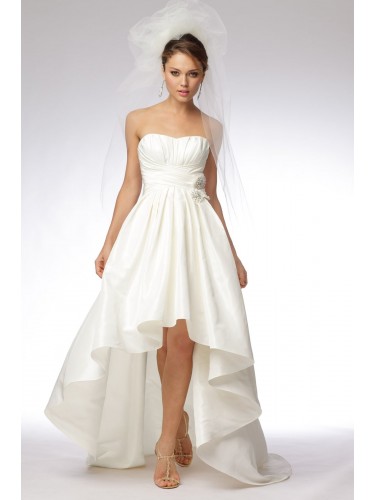 Silky taffeta strapless high low mini ball gown with draped bodice and set of 3 beaded brooches and pockets. Sweep train.