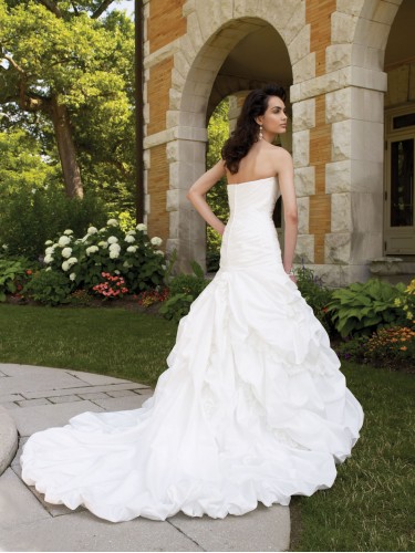 Shipping Weight: 3.5KgStrapless taffeta and tulle ball gown with crumb-catcher bust line, sunburst pleated bodice, dropped waistline accented with side three-dimensional handmade lace flower, split front apron skirt trimmed with ruffled lace features a tulle underskirt accented with trailing lace appliqu