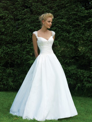 This romantic, Ball Gown combines taffeta and lace beautifully. The fitted bodice criss-crosses asymmetrically with accents of lace while delicate straps make it stunning. The full skirt and sweep train complete this gown.