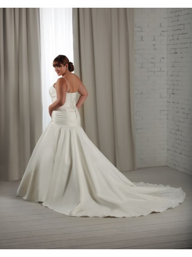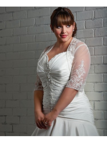 Shipping Weight: 3.5KgA dropped waist ball gown with beaded spaghetti straps leading to the sweetheart neckline. Pleating wraps around the fitted lace up bodice with embroidery and beading down the center. The circular skirt is cut very full creating a flowing hemline and decorated semi-cathedral train. The 3/4 Length bolero jacket is sheer emphasizing the embroidered lace details.