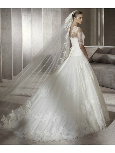 Specials: Tulle Softly Curved Neckline Lace Appliqued Illusion Overlay with Sabrina Neckline and Sleeves with Beaded waistline with Bow back and Draped Skirt with Lace Applique Accents Chapel Train